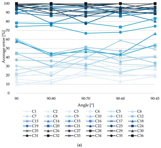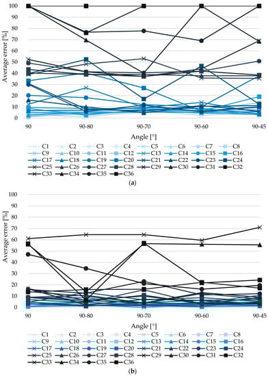 Figure 6 displays the width error values obtained from measuring the models of each series with different combinations and angle variations. In Figure 6, it is observed that for this case the inclusion of angle has a minimum impact (less than 2%) for cases with the least error, which are the relevant ones, since those manage to reliably measure the geometric characteristics of potholes. For higher height cases the reduction of the error when incorporating oblique angles is up to 60%, with errors around 50–60%.