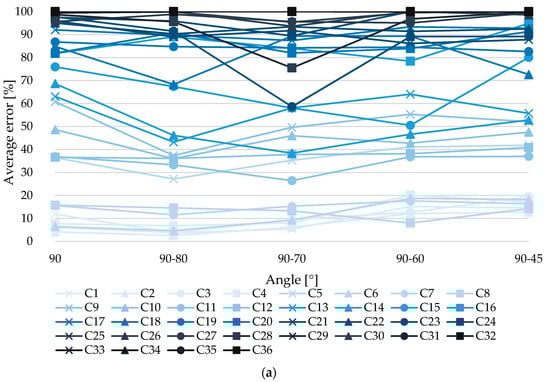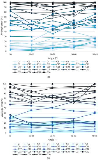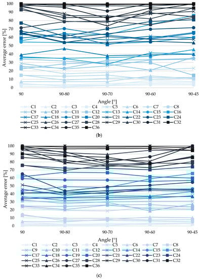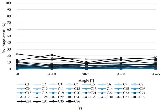 Figure 7 displays the volume error values, obtained from the measurement of the models of each series with combinations and angle variations. According to the figure, the horizontal axis is the variation or combination of camera angle for photo acquisition, while the vertical axis in Figure 7a–c is the average error of measuring pothole volume by severity level, low in Figure 7a, middle in Figure 7b and high in Figure 7c. In Figure 7, for the best case, the reduction from considering only the vertical angle (90°) is 39%.