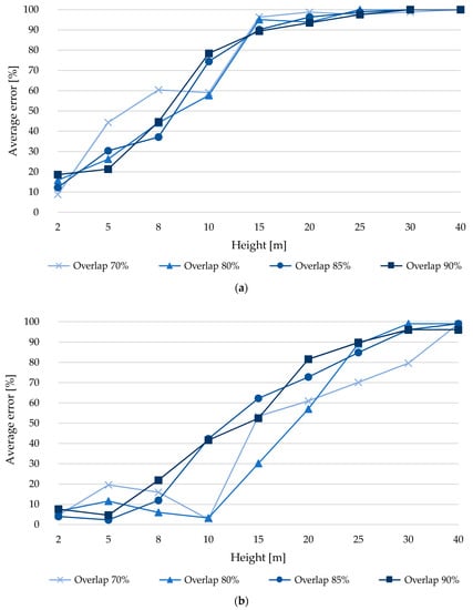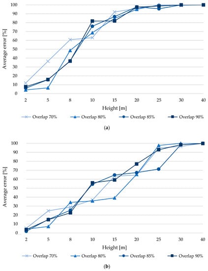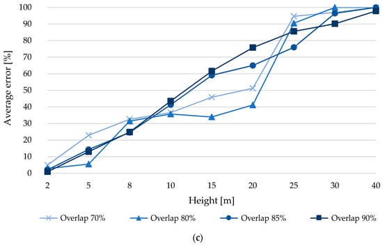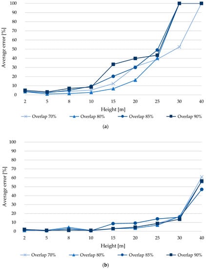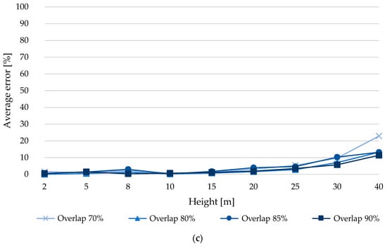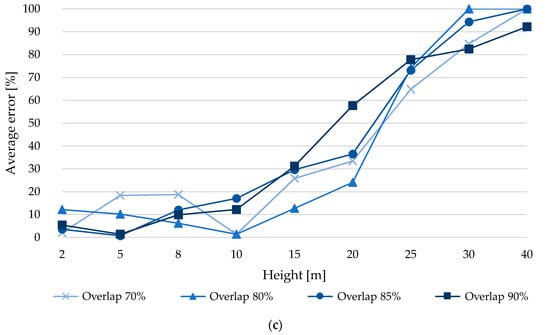 From Figure 10b, a trend is observed of overlapping error increases as the capture height grows. On the other hand, it is observed that the error at 10 m is greater than 30% for overlaps of 75 and 80% and more than 50% for overlaps of 85 and 90%, indicating that the experiment does not work properly for this type of analysis. However, the error is reduced from what was observed in the previous analysis. At 2 m, the minimum error was 1.9%, which is associated with an overlap of 85%, this error is 1.8% lower compared to an overlap of 90%, even more so the error is reduced by more than 2.3% compared to overlaps of 75 and 80%. At 5 m, the 80% overlap has the lowest error (7.3%), an error that is 7.5% less compared to a 90% overlap. Moreover, the error is reduced by more than 7.8% compared to 75 and 85% overlaps. At 8 m, the least error (22.5%) was obtained with a 90% overlap. At 10 m, the least error was obtained (35.8%) with an overlap of 80%, which has 1% less error compared to the overlap of 75%, while for an overlap of 85 and 90% the error is reduced by 18.6 to 20.1%. At 15 m, the minimum error value (39.1%) was obtained with an overlap of 80%, which has between 20.0 and 25.6% less error compared to the other overlaps (75, 85 and 90%). For 20 m and an overlap of 75%, an error of 64.6% was produced, which is the lowest for this height, comparing this error with respect to overlaps of 80 and 85% there is a difference between 0.8 and 2.8% less error respectively, more than that, the error is reduced by 11.6% compared to an overlap of 90%. At 25 m, the least error was obtained (71.3%) for an 85% overlap, which is between 21.6 and 26.4% less error compared to other overlaps (75, 80 and 90%). At 30 m, the error obtained was 96.5% for an overlap of 75%, which is the lowest and at the same time high considering its magnitude, so it loses practical value. At 40 m, the error is higher than that obtained at a height of 30 m. From the above it is observed that from 30 m it loses practical value.