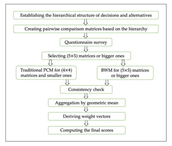 However, in the proposed AHP–BWM model, the evaluator has to evaluate only twenty comparisons. The main steps of the proposed AHP–BWM model are shown in Figure 2.