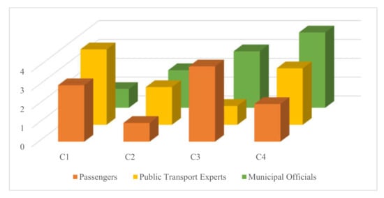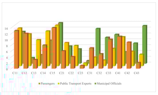 Table 8 demonstrates the results of the evaluator groups in level 2. The combined AHP–BWM model was applied due to three (3 3) matrices (AHP) and one (5 5) matrix (BWM). Level 2 results exhibit this phenomenon more explicitly (see Table 7). “Mental comfort C23” has the priority as it is ranked on the first position to be improved for the three groups. Reference [] worked on the safety of public transportation in developing countries to improve it by conducting a specific agenda. This underlines the necessity of reorganizing the public bus network in the city, or might hint on examining the drivers’ behavior of public buses and on initiating the training of drivers to avoid and minimize the safety of travel issues, and accordingly, the mental comfort for the passengers will be improved. While “Discounted tickets for pensioners or students C43” has the priority to be improved from the passengers’ evaluation perspective, "Directness C12" is the second priority for municipal officials improve (second place in level 2), due to their belief that this criterion will raise the demand on public buses in the city. “Info before travel C32” has the second position for public transport experts (Figure 4); the experts believe that initiating a new mobile application to let the traveler know more information about the journey will raise the reliability and demand on public transportation above the current situation.