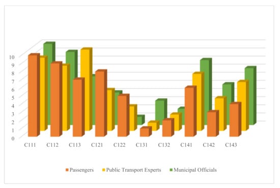Table 9 presents the stakeholder results for level three in the sequence (passengers, public transport experts, and municipal officials). For the third level and from the municipal officials’ preferences, the model results showed “Fit connection (C122)” as the most significant supply quality factor related to public transportation. This result can be justified as that connection between bus lines and routes, or between buses and other types of public modes are essential to ensure the directness of the system [], although “Frequency of lines (C131)” is the most significant criterion that needs improvement from the passengers’ point of view. Same as passengers, the public transport experts evaluated “Frequency of lines (C131)” as a priority to be improved subsequently, and the model results observed the “Distance to stop (C111)” criterion at the last position for both passengers and municipal officials (Figure 5), which means that it can be the last issue on the list to be improved.