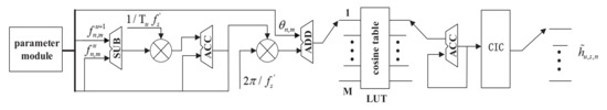 For an arbitrary MIMO channel, the number of channel fading generation module should be and they could consume huge of hardware resources. As the maximum Doppler frequency is usually much smaller than the system sampling rate, in this paper we use a low initial sampling rate to generate the channel fading, which can greatly reduce the hardware consumption. The implementation scheme of channel fading generation is showed in Figure 5. First, the parameter module updates the Doppler frequency and phase in real time. Then, it passes them to the subtractor (SUB), accumulator (ACC), multiplier, and adder (ADD) to complete the corresponding integral operations and generate a look-up table (LUT) address. The values of the cosine function stored in the cosine table can be found by the LUT address, and they are superimposed by the accumulator to obtain the channel fading coefficient. Finally, the cascaded integrator comb (CIC) filter is used to interpolate and match the data rate.