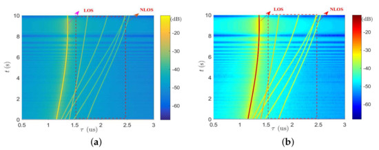 Based on the parameter calculation method of GBSM in [27], we can obtain the theoretical time-variant PDP under the above scenario as shown in Figure 8a. As we can see, as the MS has an initial distance of 318 m from the BS, the initial time delay of line-of-sight (LOS) path equals to . The time delay of non-line-of-sight (NLOS) paths can also be calculated and shown in Figure 8a with the dotted line. By using the ILA software, we store and export the data from the hardware emulator, and then analyze the data with Matlab. Finally, the measured time-variant PDP of emulator is given in Figure 8b, which clearly shows that it is consistent well with the theoretical one.