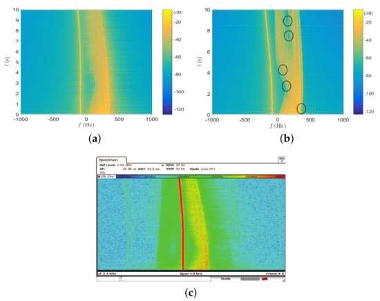 Under the same condition, the time-variant DPSD is also tested and verified. With the help of (22) in [27], the theoretical time-variant DPSD is firstly calculated and shown in Figure 9a. For comparison purposes, we also give the simulated time-variant DPSD based on the model in [17] in Figure 9b. It is clearly showed that the part around circles is different from the theoretical one. The main reason is the output Doppler phase of that model is discontinuous which results in the output Doppler frequency or DPSD not accurate. In order to observe the output DPSD directly, a 2.4 GHz cosine signal generated by a Agilent E4438C is adopted as the input signal. Then, the measured DPSD of proposed emulator can be obtained by a spectrum analyzer of ROHDE&SCHWARZ FSV. The measured result is shown in Figure 9c. Due to the randomness and distortion caused by the fixed point process, the measured result can only be qualitatively compared with the theoretical one. Figure 9a,c show that the shape and trend of two DPSDs have a good approximation, which also validates the effectiveness of proposed emulator.