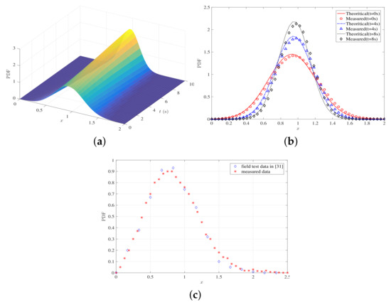 (a) The theoretical results of time-variant PDFs, (b) the measured time-variant PDFs of proposed emulator at different time instants, and (c) the measured PDF of proposed emulator and the PDF of field test.