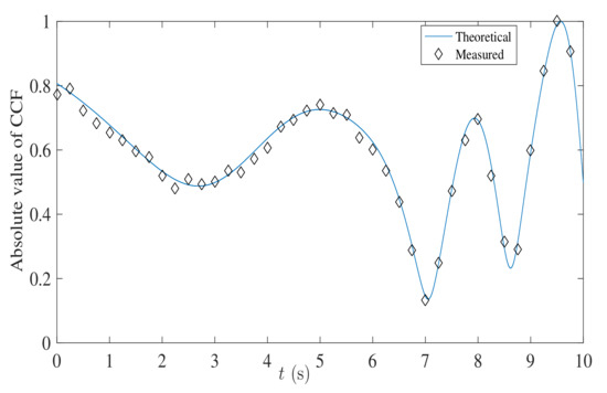Based on the theoretical expressions of (28)–(30) in [32] and (9)–(10) in [33], the absolute values of time-variant CCF of firt two paths are calculated and given in Figure 11. In the figure, we assume that the antenna spaces of the BS and MS are the same, and equal to twice the wavelength of carrier. Then, the measured CCF of proposed emulator can be obtained in a similar way as mentioned above and given in Figure 11 for comparison purpose. As can be seen from the figure, the CCF changes over time due to the movement of the MS. Again, the measured CCF aligns well with the theoretical one, proving the correctness of output correlation properties.