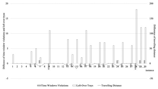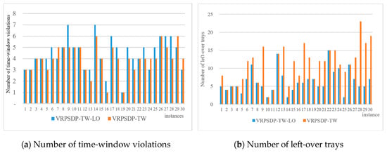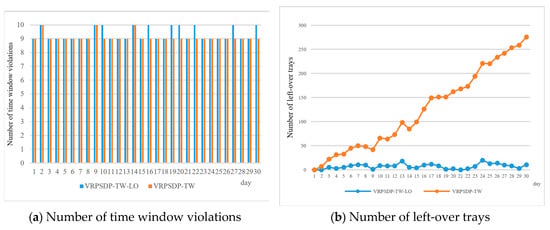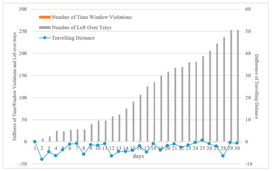 The difference between the two models in terms of total cost on each day were not significant during the initial 10 days; no greater than 14.9%. However, it gradually increased after 10 days. Eventually, the total cost became 61.8% on the 30th and final day. This means that VRPSDP-TW-LO can save more than 60% of the cost of VRPSDP-TW. It can be inferred that the cost difference arises from the number of left-over trays. Figure 5 shows the number of time window violations (a), and number of left-over trays (b). Figure 6 shows the result of the integrated comparison of the differences in travelling distance, number of time window violations, and number of left-over trays. Where the number of time window violations was not significantly different, the difference of the number of left-over trays gets bigger as time goes on. In addition, the total travelling distance did not show significant differences between the two models; it was less than 10 km. As previously described, VRPSDP-TW does not consider the number of left-over trays for the pick-up service and load as many as the remained capacity of the vehicle after delivery service. Therefore, the number of left-over trays gets bigger as time goes on. In addition, there is a limitation to the trays which each distribution center can keep and manage; the additional vehicles should be arranged to only pick up the left-over trays. This causes additional costs and several issues for keeping and managing trays.