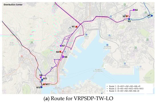 Figure 3 shows one example of 30 daily operations. For both VRPSDP-TW and VRPSDP-TW-LO, all 12 stores in a same region are supported by three vehicles. The routes for each vehicle are different. The results of daily operations for 30 days were acquired based on these different vehicle routes.