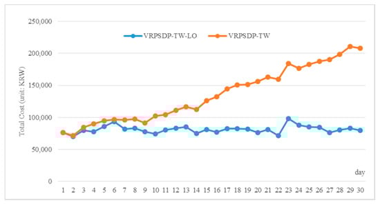 Daily total cost of VRPSDP-TW-LO and VRPSDP-TW.