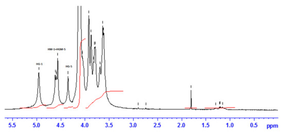 For the structural characterization of the alginate blocks, 1H NMR spectroscopy was performed as a suitable method for the structural determination of uronic acid polymers. 1H NMR spectrum, shown in Figure 1, indicates the signal areas of HG-1 (A1), HM-1 + HGM-5 (A2), and HG-5 (A3). According to Grasdalen [23] the equations below were used to determine the characteristic blocks and sequences of ASBB.