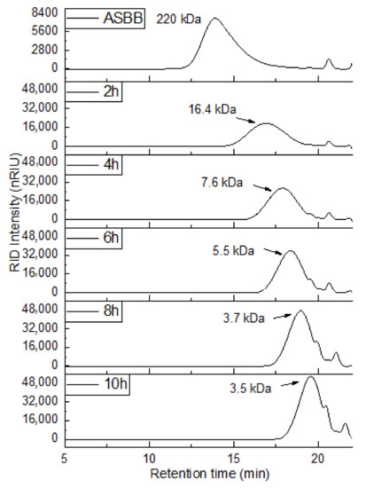 HPLC-SEC chromatography spectrum of ASBB and hydrolyzed alginate oligosaccharides (OGABs) from 0 to 10 h.