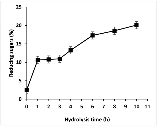 To assess the radical depolymerization reaction of the native alginate ASBB, reducing sugars in the fractions obtained after 1, 3, 6, and 10 h of hydrolysis were quantified by colorimetric assay using glucose as standard. The results obtained for the fractions are summarized in Figure 3. After 10 h of hydrolysis, the reducing sugars increased from 2.5% (w/w) in native ASBB to 20.10% (w/w) detected in the last fraction of OGABs.