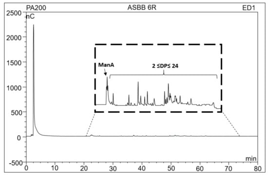 In order to study the distribution of the degree of polymerization (DP) in the fraction (OGABs-6 h) generated after 6 h of hydrolysis of ASBB, an analysis by high-performance anion exchange chromatography with pulsed amperometric detection (HPAEC-PAD) was performed. The analysis was executed with a Dionex ICS-3000 system with version 6.5 of Chromeleon (Dionex Corp., Sunnyvale, CA, USA). The distribution of DP in the OGABs-6h fraction was carried out at 25 °C on a CarboPac PA-200 column (4 mm × 250 mm) fixed to a CarboPac PA-200 guard column (Dionex 4 mm × 50 mm). A gradient of A (NaOH at 100 mM) and B (NaOH at 100 mM and NaOAc at 250 mM) was used as eluent with a flow rate of 1 mL/min. Then, 20 µL of filtered samples at 1 g/L were injected.