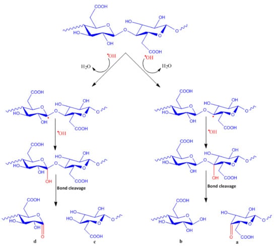 Proposed action of •OH on alginate. Reducing end: (a) Pyranone groups, (d) Lactone groups, and non-reducing end: (b), (c) glycopyranose groups.