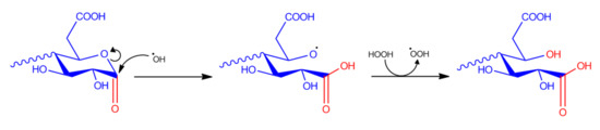 It has been reported that H2O2 treatment under extreme conditions can break the sugar cycle and that recombination reactions between the different radicals can occur [51]; and since the reaction system contained in the presence of excess H2O2, the carbonyl group of the lactones group in the new reducing end generated can be largely oxidized to a carboxyl group [52] as illustrated in Figure 6.