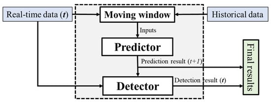 The proposed method is an upgrade that is based on our previous study. It is designed to share the same structure of management, containing a real-time predictor and a pattern matching-based anomaly detector, and be engined by a moving window in each step [5].To realize the real-time automatic model optimization, balance the prediction accuracy and calculation speed requirements, the moving window is designed to select the real-time load data (t) and the historical load data from the previous 24 h of data data(24 h) as the inputs of the predictor and to update the prediction model [5]. Figure 1 illustrates the framework of this method. After obtaining the prediction result, the proposed pattern matching-based anomaly detector classifies the data(t) and the prediction result. The final output is composed of the prediction result for the next step and the classification result of data(t).