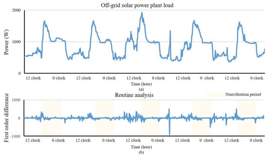 The results of routine analysis. (a) Off-grid solar power plant load; (b) Routine analysis. As our method is applied in a rural area of Tanzania, the power consumption of the entire village is relatively low.