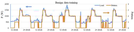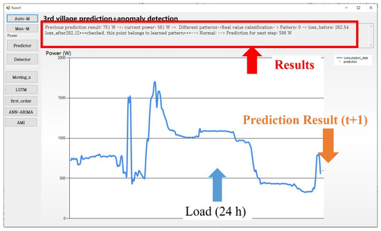 Figure 7 shows another test result in the normal monitoring case, in which the prediction result was affected by normal random events in daily life. In this test, the previous prediction result was 751 W, but the current load (t) was 561 W. The two results exhibit two different patterns. Therefore, according to the detection rule of the proposed pattern matching-based anomaly detector, the cross-entropy loss function is employed to evaluate the classification result of the real load. The loss difference is smaller than 3. Therefore, the result is verified as acceptable. The difference between the prediction result and the real load is caused by normal variations in the residential electrical load. Finally, the predictor forecasts a prediction for the next step (t + 1) to be 596 W.