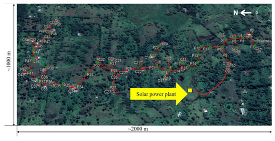 In South Korea, to ensure the normal operation of these three power plants, three different kinds of power management systems were developed to detect the power usage of each power plant separately in real time. To further discuss the feasibility of each proposed method in future work, all the proposed methods were implemented in the same desktop computer with a 3.4 GHz Intel Core i5 processor, 4 GB RAM, and the Windows 10 operating system [5,17]. The proposed system in this work was applied to manage the load of the third off-grid solar power plant. The wiring diagram for this village is shown in Figure 5. In each step, if the method finds that the real-time load does not match any learned pattern, a warning will be issued to the manager of the system to remotely control the power plant in Tanzania.