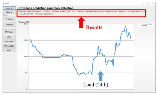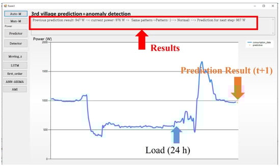 Figure 6 shows the user interface (UI) of this system. The current load is 976 W. In the previous step (t−1), the predictor forecasted the next load to be 947 W (yellow point), i.e., 479 W. Therefore, according to the results of the proposed pattern matching-based anomaly detector, both the real load of 976 W and the prediction result of 947 W are associated with pattern 1. Therefore, the power usage was normal. Moreover, a moving window was used to select the historical load data over the previous 24 h and update the predictor; the prediction indicated that the load at the next step would be 967 W. The prediction results first be used to check the remaining power of the battery to decide if it is necessary to shut off the power of some households. Then, it can also serve as a reference for the next detection step.