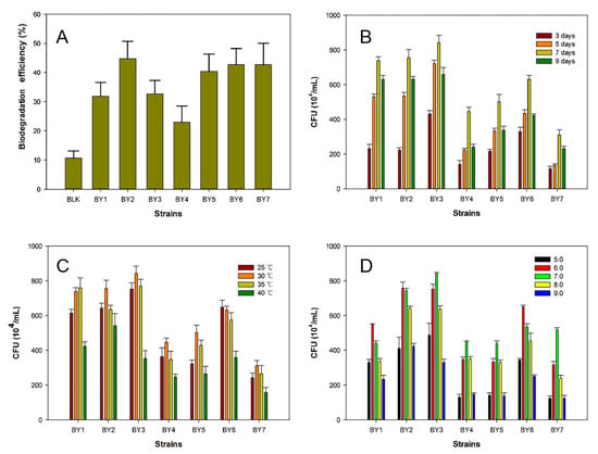 Biodegradation efficiency for the isolated strains in MS medium (A) and colony numbers under different growth conditions: incubation times (B), temperatures (C), and pH values (D).