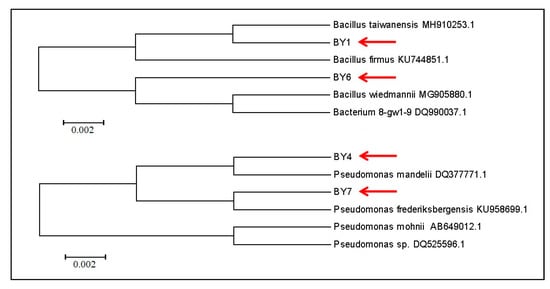 The isolated strains were identified using 16S rRNA gene sequencing (Figure 2 and Figure 3). BY1 and BY6 were found to belong the genus Bacillus, while BY4 and BY7 were Pseudomonas species. Both of these genera have been widely reported to contain bacteria that are capable of degrading compounds including polyvinyl chloride, phthalate ester, eugenol, endosulfan, and dibenzothiophene [,,]. BY1 exhibited a 99.2% similarity to Bacillus taiwanensis, which is a nitrate-ammonifying bacterium and a partial denitrifier. Previous studies have reported that Bacillus vireti is able to degrade benzo[a]pyrene, a common cause of cancer, and lignocellulose []. BY6 exhibited 100.0% similarity to Bacillus wiedmannii, which has been reported to be able to degrade polyethylene after 120 days incubation with a 51.53% efficiency and also exhibits biomineralization potential and hydrocarbon-degrading ability []. BY4 was identified as Pseudomonas mandelii, which has been reported to contain a hcdABC gene cluster that is necessary for 7-hydroxycoumarin degradation []. BY7 exhibited a 99.9% similarity to Pseudomonas frederiksbergensis. Previous studies have revealed that P. frederiksbergensis is an effective bioinoculant for enhancing cold stress tolerance in plants and could promote plant growth in soils with high saline levels []. However, it has not been previously reported to possess petroleum-degrading ability.
