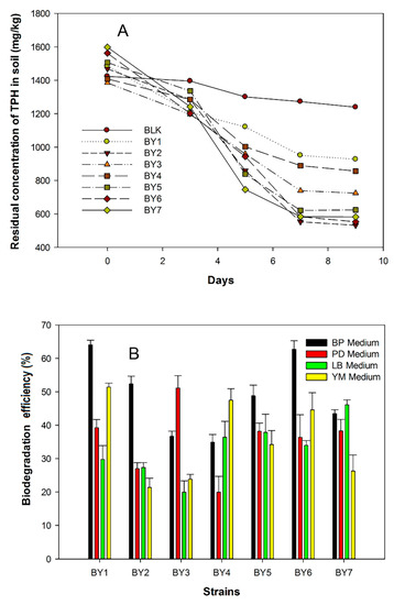 Residual concentration of TPH in soils using the isolated strains (A) and biodegradation efficiency in different growth media (B).