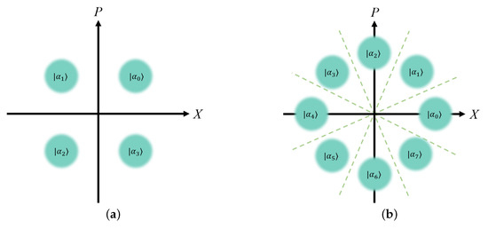 Phase space representations of coherent states with (a) four-state modulation and (b) eight-state modulation.
