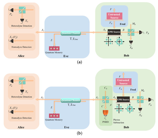 - Fred prepares a EPR state . Fred can be a neutral party; however, to derive the tight security bound, Fred is assumed to be controlled by Eve, that is to say, Fred would introduce the untrusted source noise. Notice that the state is utilized to simulate the coherent state with extra untrusted noise , which characterized by a phase insensitive amplifier (PIA) with a gain g in the PM scheme. Namely, the state is virtually a two-mode state [43] and the calculation method of two-mode entanglement state is still suitable. The quadratures and of Bob and Alice respectively can be expressed aswhere ( with the shot noise variance 1) and . Here, is the variance of vacuum noise.