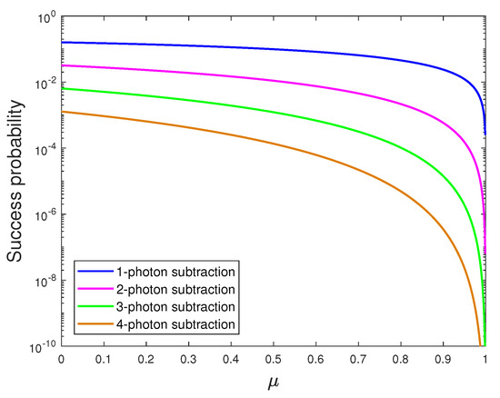 Here, , and are the annihilation and creation operators, respectively, on Alice’s and Bob’s mode. The success probability of subtracting m photons can be calculated as