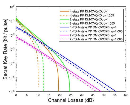 We can derive from [54] that, after photon subtraction operation with a given , the of the two-mode squeezed vacuum (TMSV) state is the same for four-state and eight-state modulation. Namely, the four-state and eight-state modulation protocols demonstrate the similar performance after photon subtraction, so that we take the four-state modulation protocol into account without loss of generality while performing the PS-based PP scheme in the DM-CVQKD. Notice that, after the PS operation, the entanglement degree of the coherent state is strengthened [13].