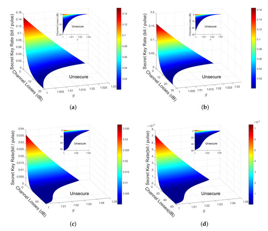 Figure 5 shows the secret key rate of the plug-and-play DM-CVQKD as a function of channel losses for the tunable g. Figure 5a,b are the four-state and eight-state PP DM-CVQKD protocols, respectively. Figure 5c,d are the protocols with 1-PS and 2-PS operations, respectively. The insecure area shown in the chart signifies that the secret key rate is zero or negative, which means that Alice and Bob cannot acquire the secret key sequence. Compared with the four-state PP DM-CVQKD, the eight-state PP DM-CVQKD could tolerate more untrusted source noise for the same channel losses. Furthermore, after applying 1-PS operation, the four-state PP DM-CVQKD could demonstrate the longer transmission distance for the same value of g, whereas it tolerates more untrusted source noise at the same channel losses owing to the enhancement of entanglement degree.