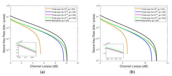In the asymptotic case, the number of communication signals is deemed to be infinite [55]; in other words, the channel is totally known. In practice, it is impossible for the number of exchanged signals to be infinite so we have to take the finite-size effect into account. Figure 6 shows the secret key rate as a function of channel losses in the finite-size scenario. Figure 6a,b are the four-state and eight-state DM-CVQKD, respectively, while Figure 6c,d correspond to the schemes involved the 1-PS and 2-PS operations, respectively. We find that the secret key rate of DM-CVQKD in a finite-size scenario is lower than that of the asymptotic case whether it performs the PS operation or not. The finite-size secret key rate is closer to the asymptotic case with the increasing block size N of transmitted photons due to the fact that more signals could be utilized for parameter estimation and the quantum channel would be closer to being entirely known. Generally, the channel characters will not be estimated perfectly because of the finitude of signals so we need to consider the worst case. The analysis of finite-size effect and the calculation of the secret key rate of the PS-based PP DM-CVQKD system for the finite-size scenario is shown in Appendix B.