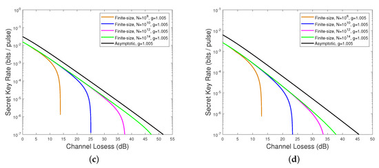 finite-size scenario. (a) PP four-state protocol; (b) PP eight-state protocol; (c) 1-PS PP four-state protocol; (d) 2-PS PP four-state protocol. The parameters are as follows: the modulation variance , the channel excess noise , the reconciliation efficiency and the gain g = 1.005.