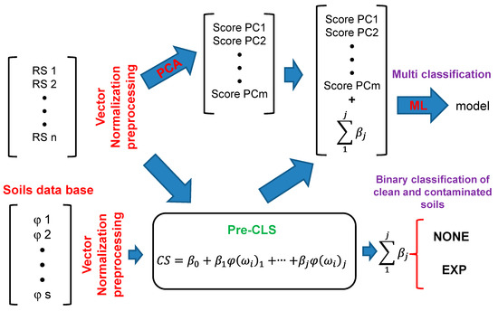 The spectra were preprocessed before they were evaluated by the ML methods. The preprocessing scheme employed in this study is shown in Figure 1. First, all spectra were normalized using vector normalization (VN) preprocessing. Next, the spectral data were reduced using principal component analysis (PCA) from 3057 points to 20 PCs. Separately, the preprocessed spectra were compared with those in a database of soils. Subsequently, a classical least squares preprocessing (Pre-CLS) [36] was applied to the original spectra to extract a parameter that was proportional to the percentage of soil from the database spectra. Finally, PCA and the extracted parameter were used to generate the ML models.