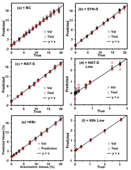 All spectra were converted to the Kubelka–Munk function [63] because the reflectance values for all samples were very low. This transformation is appropriate for the diffuse reflectance spectra of powders [64] with R values <60% [65]. The models were generated using this transformation. The graphs plotting the predicted versus true values for the samples used in CV and testing are shown in Figure 2, where the CV data are represented with open diamonds. In contrast, the test data are represented with open triangles. The solid black line represents the ideal case or perfect model (y = x), where the predicted values are equal to the true values throughout the entire data range.