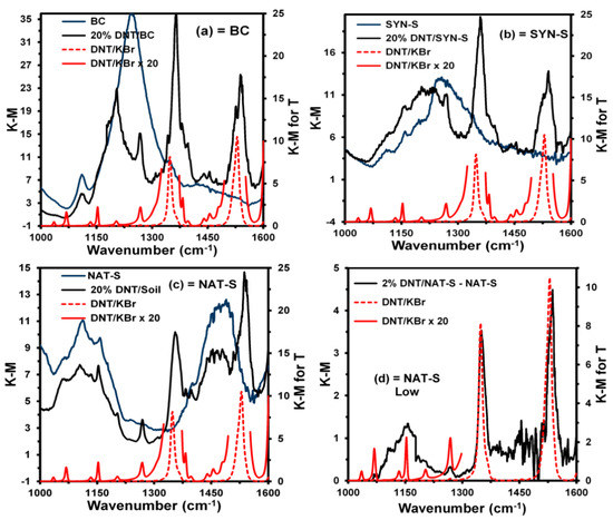 DNT spectrum in the investigated soil matrices in K-M (K-M for T: K-M calculate from transmittance for red spectra): (a) BC; (b) SYN-S; (c) NAT-S, and (d) NAT-S Low.