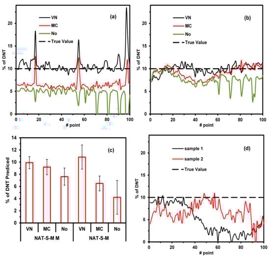To test the NAT-S model, a map of three new types of samples was analyzed, and a map of 10 × 10 mm2 (100 points) for each sample was generated. Two samples comprised the same soil as that used in the NAT-S models and were contaminated with 10% of DNT. The first sample consisted of a simple mixture (NAT-S-M). The second sample involved mixing and macerating the components (NAT-S-MM). The concentrations were predicted using the NAT-S model with three preprocessing methods: VN, MC, and no preprocessing. The map for the NAT-S model with VN is included in Supplementary Materials: Figures S6–S9, while the predictions for the 100 points for each map using different preprocessing methods are shown in Figure 4a,b. VN preprocessing applied to both samples (NAT-S-M and NAT-S-MM) resulted in better results, with the predicted values being close to the true value on average (10% DNT, see Figure 4c). MC preprocessing worked better in NAT-S-MM than NAT-S-M. This indicates that while the macerated process homogenized the size of the particles, MC was not able to compensate for the difference in the particle size. In contrast, the VN preprocessing method was able to compensate for these differences. The prediction of DNT in NAT-S-M shows peaks of high DNT concentrations (>10% DNT). This is because the particles of DNT were not homogenized. The models with no preprocessing provided bad predictions due to the difference in the baseline of the spectra. The above discussion demonstrates that VN preprocessing corrects the spectral variation due to changes in the particle size. To demonstrate the change in spectrum with the particle size, the tested soil was sieving for three particle sizes (d): d > 0.85 mm, 0.85 mm > d > 0.25 mm, and d < 0.25 mm. One hundred spectra were acquired at various locations on the sample surface for each value of d, and the average and standard deviation of the spectra were determined (see Supplementary Materials: Figures S10 and S11). The background offset spectral decreases with d, whereas the standard deviation increases with d; however, this pattern is not consistent throughout the spectra. It is higher in the 1000–1200-cm−1 and 1400–1600-cm−1 regions. This can be explained by the fact that MC is not able to correct the background offset spectral completely in contrast to VN; VN is better because it scales the spectrum to unit vectors, whereas MC only changes the baseline.