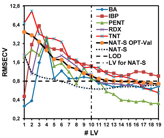 For the NAT-S OPT-Val model, 19 LV were required to obtain a good RMSECV value. Figure 5 shows the dependence of the RMSECV values for the prediction of each interference as a function of the LV. The NAT-S OPT-Val and NAT-S models were generated to determine how the RMSECV values decrease with the LV and compare the two models. The NAT-S model showed the minimum RMSECV at L = 10. Adding more LV resulted in worse RMSECV values. For the NAT-S OPT-Val model, the minimum RMSECV was achieved with 19 LV. Nevertheless, at 10 LV, the RMSECV values for other interferences were also sufficiently close to the RMSECV value for the model. For that reason, TNT and IBP interferences did not allow the RMSECV value of the NAT-S OPT-Val model to approach the RMSECV value of the NAT-S model.