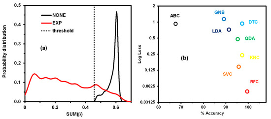 (a) Probability distribution of the sum of (SUM (β)) for a simple binary discrimination model. (b) Comparison of the tested machine learning (ML) methods in terms of their log-loss and accuracy.