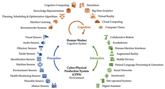 Although this discourse may appear premature and Industry 5.0 literature does not exist yet, the 5th industrial revolution is already underway among the enterprises that are just now adopting the principles of Industry 4.0. Recent years have indeed assisted in drawing attention to the human-centric design of CPPS [19] and to the genesis of the ‘Operator 4.0’, defined as a hybrid agent established as the product of a symbiotic relationship between the human and the machine [20]. The impact of the technologies enabling the Operator 4.0 on human perception, cognition and interaction capabilities is explained in Figure 2. Coined as an enabler for computers to perceive the world, the Internet of Things (IoT) paradigm evolved now full circle to aim at enriching the human perception of the CPPS (and of the environment in general) with a multitude of sensing devices and technologies. Nonetheless, the abundance of data generated by such devices has not been yet fully exploited in a production environment [21]. Augmented cognitive capabilities are needed to process, understand and analyze this amount of data to get valuable information from it. Technologies enhancing cognitive capabilities do not only include those belonging to the Artificial Intelligence (AI) sphere—i.e., cognitive computing, computer vision, knowledge representation, machine learning, recommender systems and planning, scheduling and optimization algorithms. They also include simulation for what-if scenario analysis, big data analytics, cloud computing (that provides on-demand resources, especially data storage and computing power) and virtual reality (for training and experiential learning purposes). In order to move towards more cognitive and intelligent spaces [22], human workers are also asked to cooperate with the CPPS and complement the robotic and virtual world of the automated production system through novel technologies enabling faster and more intuitive workflows [23]. A considerable amount of information and knowledge is indeed generated during the augmented cognition process that should be made available to the operator in a meaningful and intuitive way. Augmented Reality, mobile device and smartwatch apps and advanced human–machine interfaces in industry will be augmented with voice-enabled interaction, thus giving birth to digital intelligent assistants. While Industry 4.0 creates the foundation for the Smart Factory, Industry 5.0 is the era of a ‘Social Smart Factory’, where every single cooperative building block of a CPPS will be able to communicate with the human component through enterprise social networks. In the ‘Social Smart Factory’, humans will work alongside collaborative robots [24], will use exoskeletons to perform strenuous tasks [25] and will be able to control and act upon the CPPS remotely if needed. Given the close interplay and symbiosis between human and machine, it becomes compelling to pay attention to the possible consequences of Industry 5.0 on the welfare of humans interacting with these systems [26]. Bringing back human workers to factory floors is about creating meaningful and sustainable socio-technical systems to support harnessing smart technologies in organizations [27].