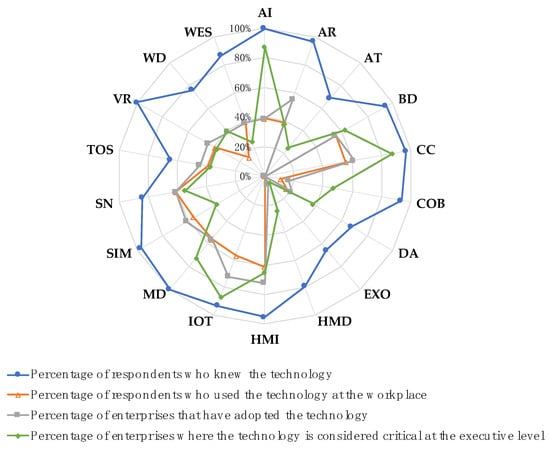 A Scalable Information Dimension (SID) and Value-oriented Semi-structured Survey [35] has been constructed to tap into respondents’ understandings, views and values about the technologies adopted to augment the capabilities of the workers as well as to tease apart the influence of a technology’s pervasiveness, proximity, granularity of information, and other scalable dimensions [35]. After the opening section for the collection of anonymous socio-demographic data, the survey comprises of four sections with a total of 42 questions. The questions delve into their prior knowledge and opinions about a large set of technologies enabling today the human–machine symbiosis in industrial environments, examine the interest of their enterprises in these kinds of technologies, and elicit human values and ethical questions related to the augmentation of workers’ capabilities in a hypothetical Industry 5.0 scenario. For the sake of simplicity, technologies included in the survey were identified with the following acronyms: Activity and Motion Trackers (AT); Artificial Intelligence, including all its subfields (AI); Augmented Reality (AR); Big Data (BD); Cloud Computing (CC); Collaborative Robots (COB); Digital Voice-enabled Assistants (DA); Exoskeletons (EXO); Health Monitoring Devices (HMD); Human-Machine Interface (HMI); Internet of Things, including machine sensors and identification sensors, e.g., RFID (IOT); Mobile Devices, e.g., smartphone or tablets (MD); Simulation (SIM); Social Networks, including tools for collaborative working and smart interaction with work equipment (SN); Teleoperated Systems, including devices for remote supervision and control, e.g., PLCs, actuators (TOS); Virtual Reality (VR); Wearable Devices, including smart clothes and smart watches (WD); and Work Environment Sensors, including visual, temperature or other sensors (WES).