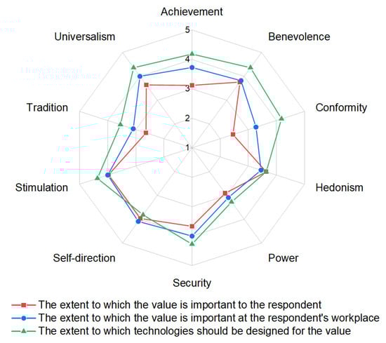 However, when it comes to technology, respondents are even more attentive to human values, as demonstrated in Figure 5. The questionnaire items analysis revealed that, while the perceived level of importance for some values does not change when associated to technology, it significantly rises for some others if compared to their personal value scale, such as in the case of ‘conformity’, ‘tradition’, ‘achievement’, but also ‘universalism’ and ‘security’. This result captures the conflict between the disruptive effect of technology and the workers’ inclination to preserve the past and resist change in the workplace in order to maintain the status quo. The ‘security’ value confirms this interpretation, as workers—especially older adults—strive to get stability and safety in their workplace (something that the introduction of new technologies cannot guarantee in their opinion). In contrast to the ‘conservation’ mindset, workers—in particular younger adults—also aim at reaching goals and personal success, demonstrating their competence with technological solutions.