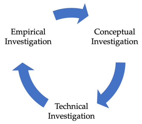VSD is chosen as the theoretical and methodological framework to guide the design of the Factory of the Future in the perspective of Industry 5.0 for two main reasons: (1) because of its inherent self-reflexivity and emphasis on enrolling both direct and indirect stakeholders into the design process and the philosophical investigation of implicated values, a coupling that is not explicitly called for as a fundamental process in other design approaches [48]; and (2) for its robustness, meaning the scope and applicability of VSD across different design spaces. VSD aims to account for multiple dynamic variables ranging from a wide array of values, technologies, social contexts, and stakeholder groups among others. In doing so, VSD promotes working at the meta-level rather than focusing on an exhaustive set of values such as safety or usability, or a particular set of stakeholders such as the differently-abled. This meta-level approach divorces VSD from any specific moral or theoretical vows and permits it to be widely applicable across sociodemographic contexts and design spaces. To this end, the VSD methodology aims to be fundamentally proactive and anticipatory, engaging with stakeholders to guide technological development in Industry 5.0 from an early stage and recursively self-improve throughout the design process as new values or tensions emerge. This reflexivity towards beneficial development is on account of the approach’s tripartite structure illustrated in Figure 7. Three types of investigations—namely conceptual, empirical and technical investigations—are necessarily iterative and in a continual feedback cycle [49].
