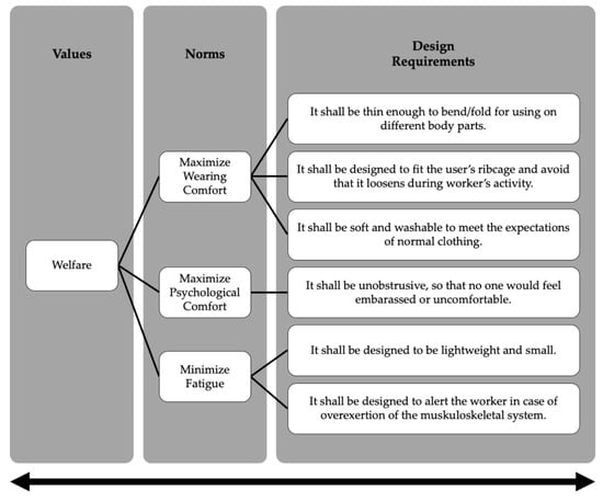 Figure 10 lays out one potential way to translate values, through norms and into design requirements that embody the value of welfare. The value was considered important in the environments in which the augmented operator works. As mentioned above, the bi-directional hierarchy of values does not prescribe one direction over the other, but instead allows for various permutations to be undertaken depending on the context of design/use and the current design paradigms that are specific to the context. Because of this, various design requirements can ultimately satisfy the final value(s).