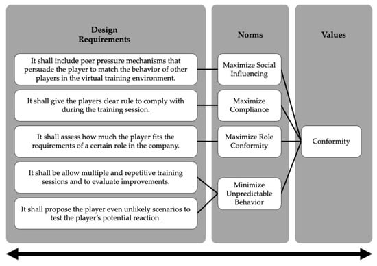 Complexity has increased significantly in production environments, thus making traditional training methods outdated. This has made necessary the integration of Modeling & Simulation methods with Virtual Reality to deliver a meaningful environment for personnel training. Prototypes of simulation-based VR training tools for augmenting workers’ cognitive capabilities and enhancing the learning speed are presented in Figure 11. In such contexts, at the beginning of the training session, the players are usually given certain directives and rules to respect in order to succeed. Multiple scenarios (even very unlikely ones, such as industrial accidents) may be experienced to test the worker’s capability to minimize impulsive behavior and assess the player’s improvements over time in terms of compliance to rules and expectations. Figure 12 lays out one potential way to translate design requirements, through norms embodying the conformity value. Of course, various other instantiations in terms of design requirements can better suit such translations. This is, of course, not an exhaustive illustration, as values are interdependent. While on one side, players are required to conform to the procedure and expectations, on the other side easygoing and uncritical adhesion to norms would minimize the worker’s capability to make informed decisions, thus potentially leaving the worker in unknown situations that are risky for health and safety. It emerges therefore the need of a discussion over the correlation of the conformity value with the trustworthiness of VR technology. Technologies that are used or will be used by the workers are shaped by human values but also transform workers’ (and people’s) identities.