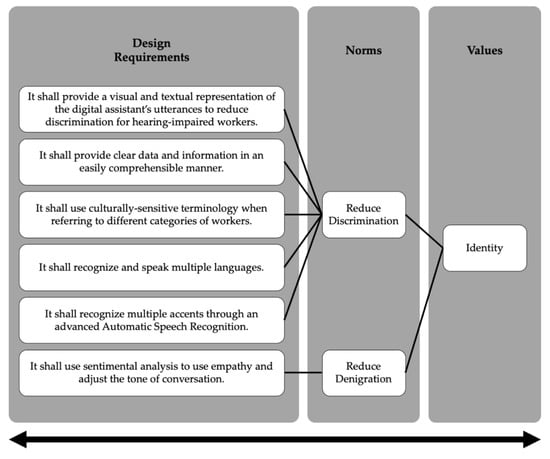 Figure 14 tackles the translation of the value of identity for the design of voice-enabled digital assistants, showing how several ethical issues (discrimination of physical-impaired workers, or by language, culture, or current mood) could potentially emerge if value-oriented design requirements are not embedded into ‘assistance technology’. One of the issues that can arise is work-related and emotional over-reliance, thus creating a potentially harmful reliance-dependence paradigm where operators are continually encouraged to use these devices for most of their duties. The risk is that a kind of emotional dependence develops, accompanied by overconfidence in the ability of the machine to support one’s tasks, even in unexpected situations. Poor design requirements that encompasses all the human values simultaneously can lead to an exacerbation of potentially harmful technical outcomes that then put human welfare in jeopardy given the system reliance on such systems.
