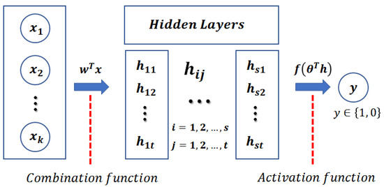 In Figure 1, is connecting weight vector from input to hidden layers, and is linear combination with . Also, we call combination function. is also a linear combination with , where is a vector of connecting weights from hidden to output layer. is a function to transform into the values between 0 to 1. This function is called as activation function, and we use logistic growth function as follows [9,12]: