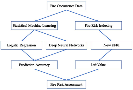 Statistics is defined as learning from data [8]. Machine learning is to make machines (computers) intelligent by learning from data [9]. So, statistical machine learning is to apply statistics to machine learning. In general, statistics uses the concept of inference with estimation and hypotheses testing [10]. In addition, statistics has a normality assumption for data [11]. Therefore, statistical machine learning leads to the improvement of the performance of existing machine learning by using inference and normality assumptions of statistics [12]. Regression is a representative method of statistics [13]. Also, deep learning is a popular algorithm of machine learning [14]. In this paper, we use logistic regression from the regression and deep neural networks from deep learning for statistical machine learning. We can consider so many methods for statistical machine learning. Most of them are for classification, prediction and clustering. The aim of this paper is to study, using a predictive model, fire risk assessment. Therefore, we use statistical machine learning models for fire risk forecasting and assessment.